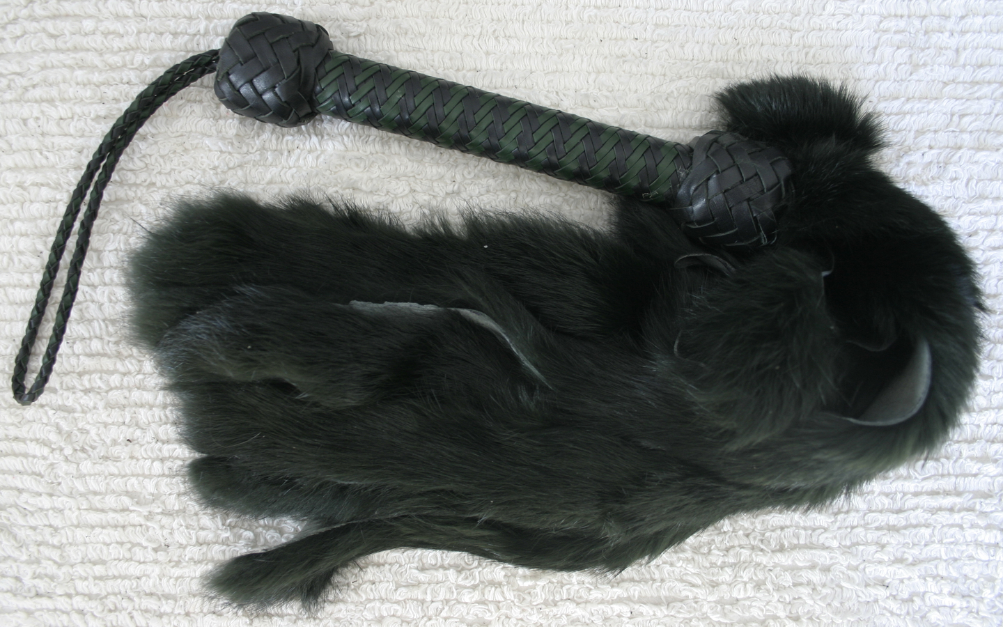 Sometimes it's fun to play with just pleasurable and loving gentleness. Sometimes you might want a silken sensation in between other, more intense sensations, or you are winding things down at the end of your scene. Bunny fur can contribute to these. Bunny is silky soft. Bunny is available in dark red, black, and dark forest green.