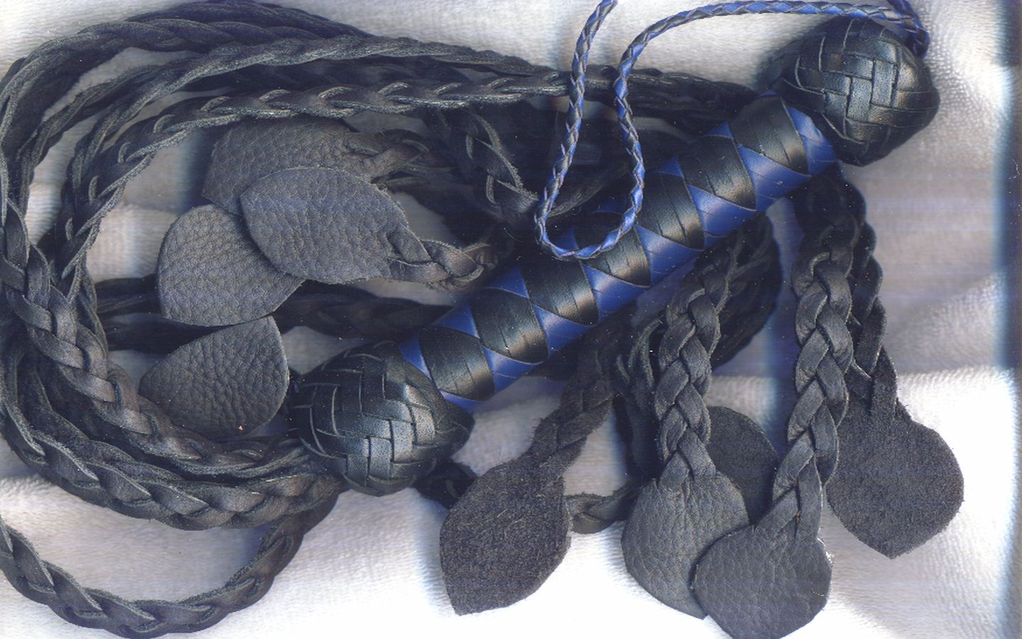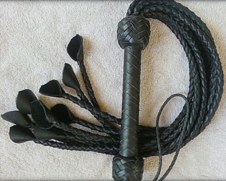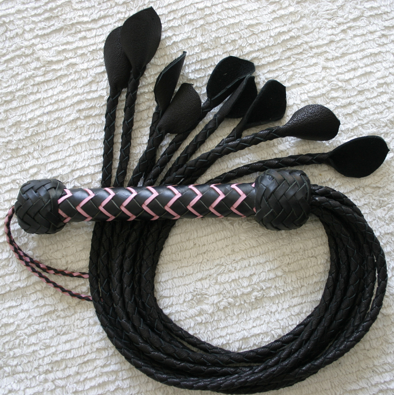 Choose between these beauties made from black or chocolate brown goathide and black cowhide. Round-braid tails, 4 strands of glovey goatskin or thin cowhide in each, ending in our signature, hand-cut leaf tips. A softer cat, not harsh or super intense, with different sensations than a flogger delivers. Very little sting. Lightweight, easy to use and control accurately. Goat is an undiscovered, luxury leather that no one else offers. This cat can also be made with smaller double leaf tips. $300 with 12-plait handle in your choice of colors and pattern.