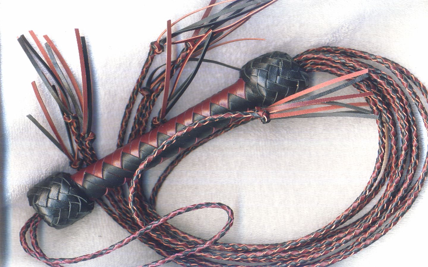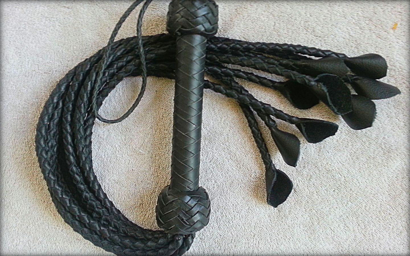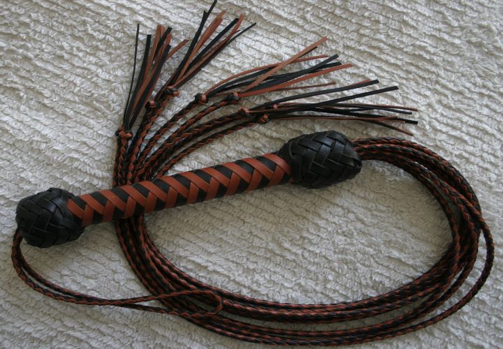 Our bison and bullhide flat cats are heavy, powerful and deliver maximum intensity. This is what you want if your play partners like the most intense, stingy, thuddy impact that a cat can deliver. Stike hard with less effort! Each tail is braided from nice, thick, black or chocolate bison or bullhide, ends in a leaf tip, and are set in a larger diameter handle than our regular one - a little over 1 inch. Bison is slightly less dense and "slappier" than bullhide. $325, including 12-plait handle in your choice of colors and pattern. The tails are abour 22 to 24 inches long.