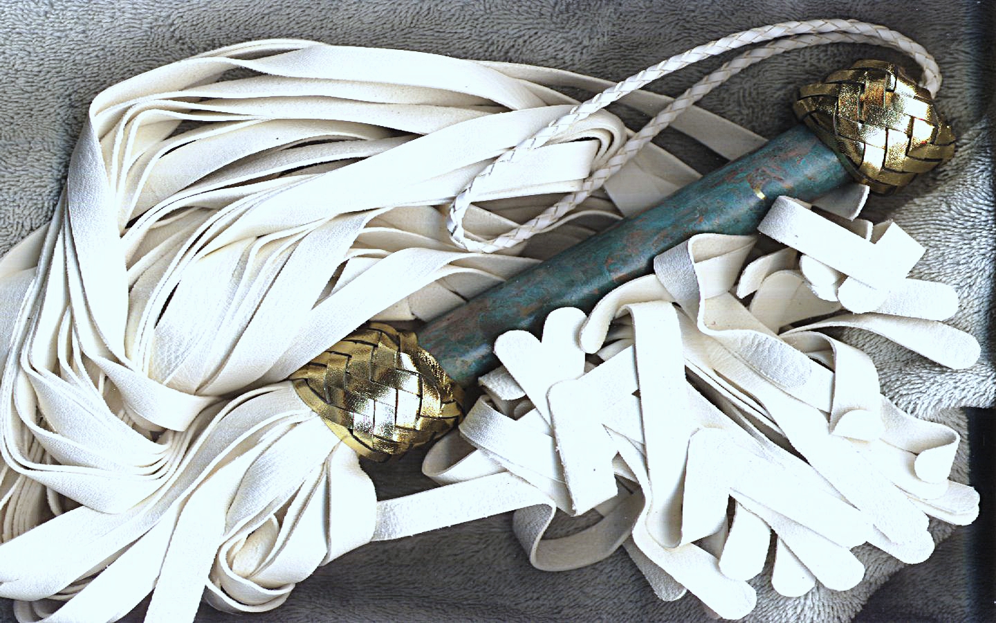 Snow white doe, sealed patinaed brass handle, gold knots. Collaring ceremonies, purity rights, weddings, special gifts.