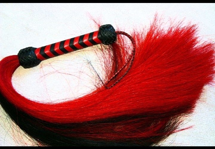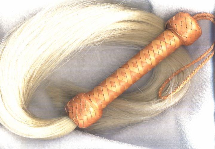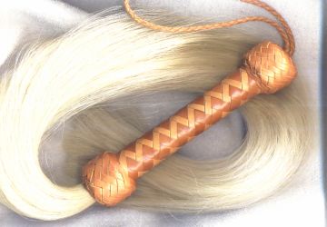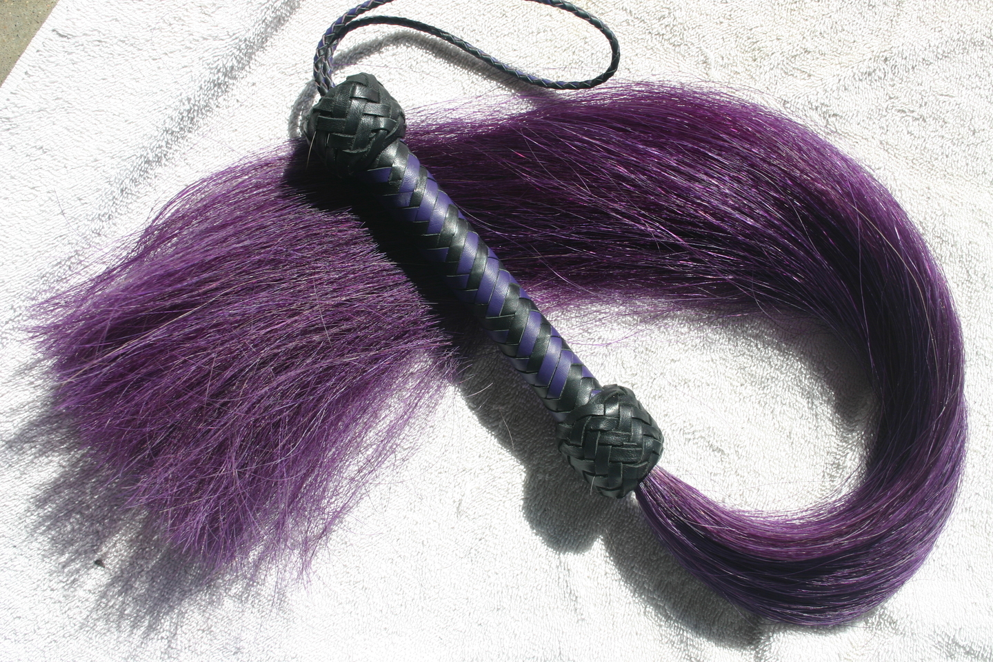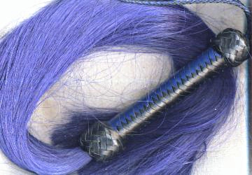 Here's a detailed look at some examples of our beautiful horsehair floggers in all their glorious variety. We offer these in 1/2 pound and 1/4 pound hanks of hair in blue, purple, black, blonde, yellow, orange, green and red. The 1/2 pound hank requires our larger diameter handle, which when braided is 1.25 inches in diameter,