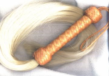 We DON'T want you to go through that with OUR horsehair floggers! And you never will! We have our own special, proprietary method of securing the hair. Our awful experience with the first flogger we bought in early 1997, a small, short horsehair that fell apart the first time we used it, will not be yours!