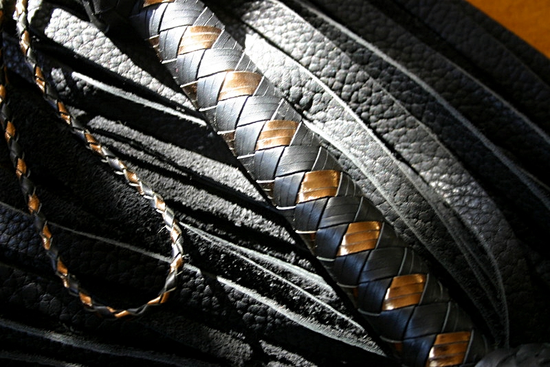 Mops are perfect when you're in a smaller space, want or need to stand close to your "victim", or the tails are from a soft hide. Bashers are best made from heavier hides so the tails fly properly and cohesively; medium cowhide, garment bison, elk, moose, heavy bison, and all weights of bullhide make excellent bashers. Mops can be used throughout a scene depending on the leather chosen for the tails. Lambskin mops make lots of whoosh and a plush, sensuous thud when thrown harder, while an elk mop creates a quite dense thuddy impact. Bashers are almost always best used after endorphins are flowing and the skin is warmed up and ready for heavier thuddy impact. Lezlie typically uses her pure-thud moose basher to end the scene, throwing it in single strokes, the handle held in both hands. Both mops and bashers can be thrown in a variety of ways and stances to add versatility.