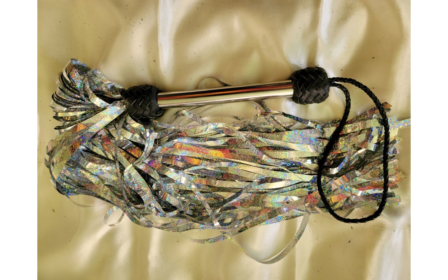 You do not use this flogger to hit hard to produce sensation. You use it in conjunction with the "lightning hands" attachment for your violet wand. The attachment can be put on the victim, or on yourself. Hold the flogger by the stainless steel handle, and when the tails contact your sub's skin, static electric sparks will be produced. That is what produces the sensation. You can drag, drape, dangle, tap, flip, and toss, this flogger in different ways to spread out the mylar tails to vary the static electric sensation and tail/skin contact. The handle has some weight so it feels solid in your hand. This is not an impact toy. Priced at $150.